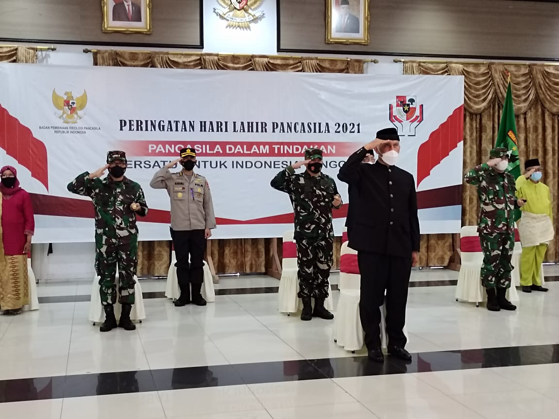 Upacara peringatan Hari Lahir Pancasila pada Senin 1 Juni 2020 digelar melalui video conference diikuti oleh Gubernur Sumatera Barat Mahyeldi Ansharullah, Danrem 032/Wirabraja Brigadir Jenderal TNI Arief Gajah Mada, Danlantamal II Laksamana Pertama TNI Hargianto, Danlanud Sutan Sjahrir Kolonel PNB M.R.Y. Fahlefie dan undangan lainnya di Auditorium Gubernuran, Selasa (1/6/2021).