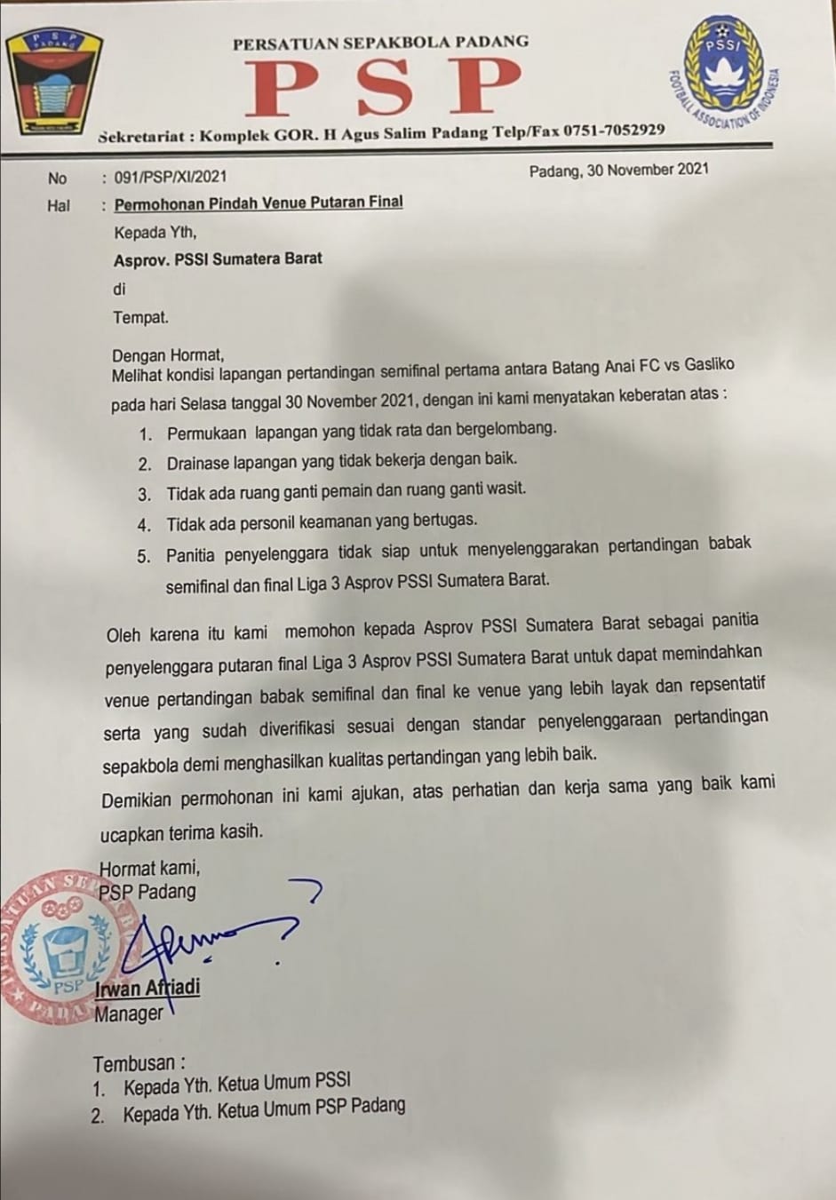 Dalam suratnya, Manager PSP Padang Irwan Afriadi, menyebutkan, setelah melihat kondisi lapangan, pihaknya keberatan diadakannya pertandingan di lapangan sepakbola Bukik Bunian tersebut, karena permukaan lapangan tidak rata dan bergelombang, drainase lapangan tidak berfungsi dengan baik, tidak ada ruang ganti pemain dan ruang ganti wasit, tidak ada personil keamanan yang bertugas, dan panitia penyelenggara tidak siap menggelar pertandingan semifinal dan final Liga III Aprov.PSSI Sumbar itu.