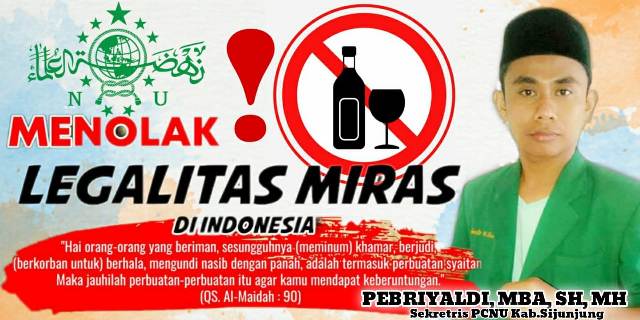SIJUNJUNG, Siberindo.co – Sekretaris Pengurus Cabang Nahdlatul Ulama (PCNU) Kabupaten Sijunjung Pebriyaldi menegaskan, masyarakat Sijunjung khusus warga Nahdiyin yang ada di Sijunjung monolak dengan tegas legalitas miras sebagai mana sikap PBNU dalam menolak pembebasan minuman keras (miras). Sikap ini merespon terbitnya Peraturan Presiden (Perpres) Nomor 10 Tahun 2021 tentang Bidang Usaha Penanaman Modal, terutama dalam lampiran III nomor 31, 32, dan 33.