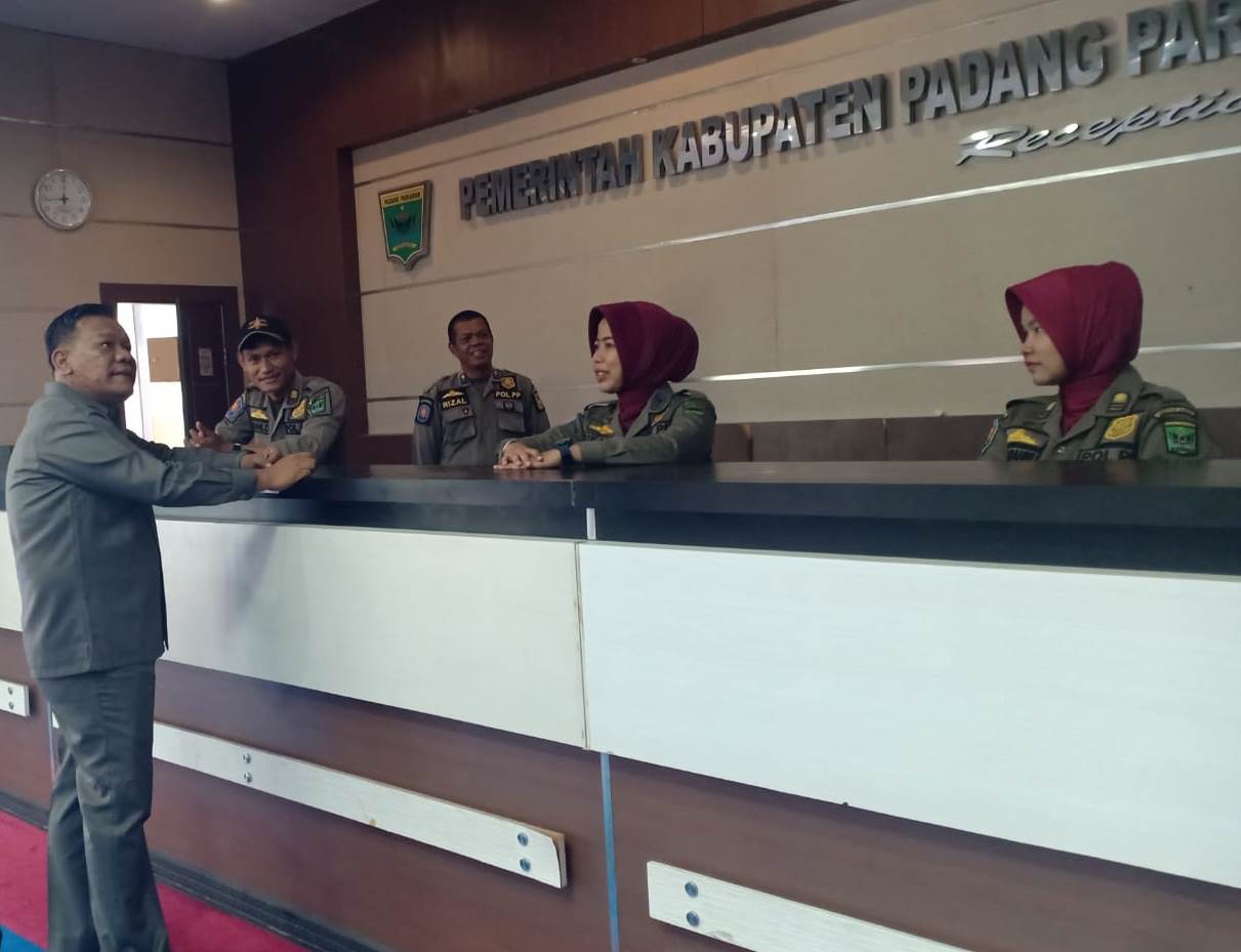 Siberindo.co – Kasat PP dan Damkar Kabupaten Padang Pariaman Rifki Monrizal, SH melakukan inspeksi mendadak terhadap anggotanya yang diperbantukan di resepsionis Kantor Bupati Padang Pariaman yang terletak di Parikmalintang. Sebagai pintu masuk di kantor Bupati, petugas Satpol PP harus menunjukkan kesan yang baik terhadap pengunjung yang datang.