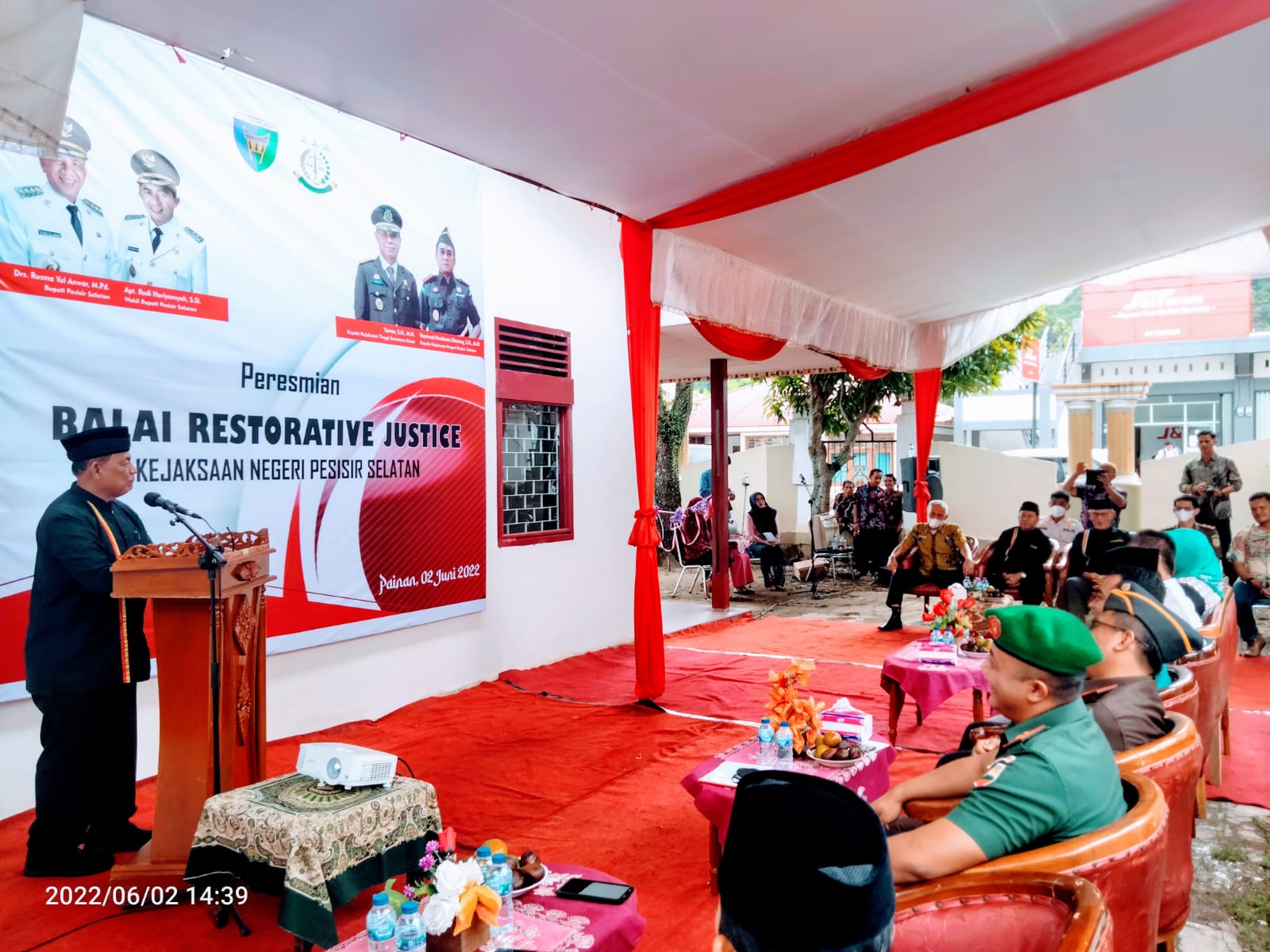 Wakil Bupati Pesisir Selatan Apt Rudi Hariyansyah meresmikan Balai Perdamaian Restorative Justice Kejaksaan Negeri Pesisir Selatan di Komplek Kantor Bupati dengan membuka selubung papan nama, didampingi oleh Kepala Kejaksaan Negeri Pessel Raymund Hasdianto Sitohang, SH.MH., Ketua LKAAM Pesisir Selatan Drs. Syafrizal Ucok, MM Datuak Nan Batuah, Pimpinan DPRD, Dandim, Kapolres dan Ketua Pengadilan Negeri Pesisir Selatan, Kamis (2/6/2022).