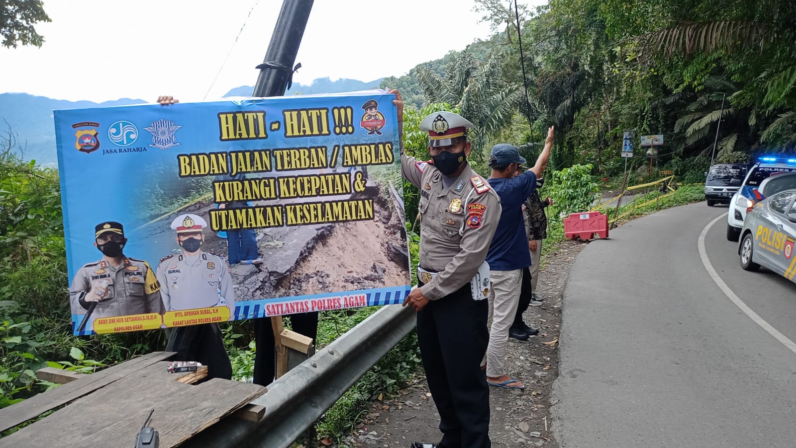 Maninjau, siberindo.co — Jajaran Satuan Lalu Lintas (Satlantas) Polres Agam menghimbau masyarakat dan pengendara agar lebih berhati-hati saat melewati jalan amblas di kawasan Kelok 44 persisnya di tikungan Kelok 9, Jorong Pasar Maninjau, Nagari Maninjau, Kecamatan Tanjung Raya, Kabupaten Agam.