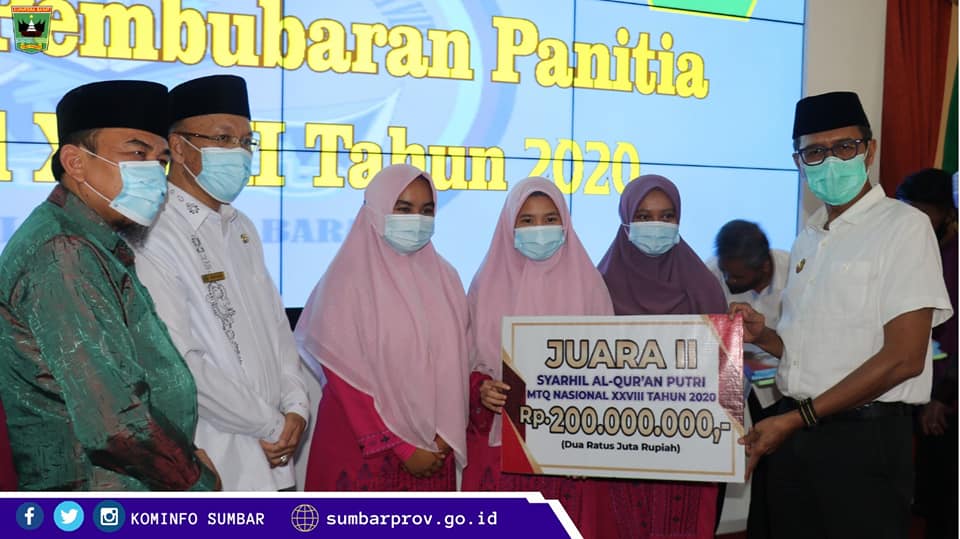 Padang, Siberindo – Gubernur Sumbar Irwan Prayitno berikan bonus kepada kafilah terbaik Sumbar MTQN XXVIII tahun 2020. Pemberian bonus ini sekaligus pembubaran panitia yang digelar di Auditorium Gubernur, Rabu (2/12/2020).