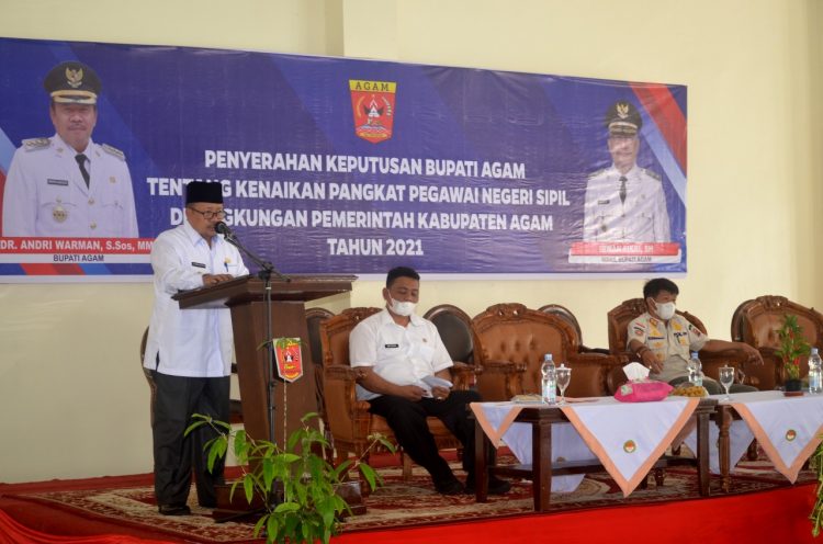 LUBUK BASUNG, Siberindo–Bupati Agam, Dr. Andri Warman, menyatakan mendukung penuh bagi PNS yang ingin melanjutkan pendidikan ke jenjang yang lebih tinggi. Bupati menyampaikan hal itu Rabu (2/6/2021) di Balairung Rang Agam di Padang Baru Lubuk Basung, komplek rumah dinas bupati dan wakil bupati, ketika penyerahan SK kenaikan pangkat PNS dilingkungan Pemkab Agam.