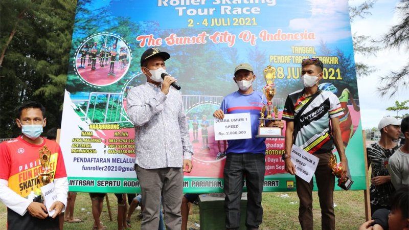 PARIAMAN, Siberindo.co — Walikota Pariaman Genius Umar didampingi Ny. Lucyanel Genius Umar menutup Pariaman Fun Roller Skating Tour Race Tahun 2021 yang digelar pada Jumat hingga Minggu (2-4/7 2021) di Sirkuit Sepatu Roda Pantai Cermin Kota Pariaman, Minggu (4/7).