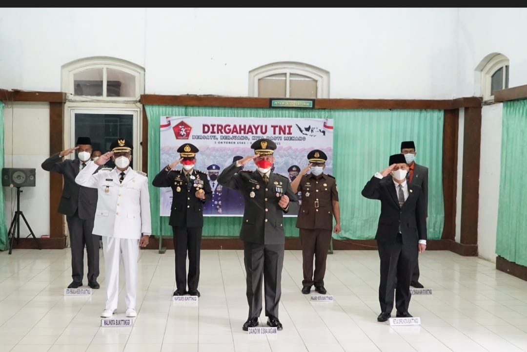 Bukittinggi, siberindo.co — Pemerintah bersama seluruh Forkopimda Kota Bukittinggi, ikuti upacara peringatan Hari TNI ke 76. Dandim 0304 Agam, bersama Wakil Wali Kota, Kapolres, Kajari, Wakil Ketua DPRD, Ketua Pengadilan Negeri, Ketua Pengadilan Agama, mengikuti upacara secara virtual, di Aula Kodim 0304 Agam, Selasa (05/10). Dandim 0304 Agam, Letkol. Arh. Yosip Brozti Dadi, menjelaskan, untuk tahun 2021 ini, HUT TNI mengangkat tema, “Bersatu, Berjuang, Kita Pasti Menang”. Dimana tema ini diarahkan pada seluruh aspek, terutama dalam melawan covid-19.