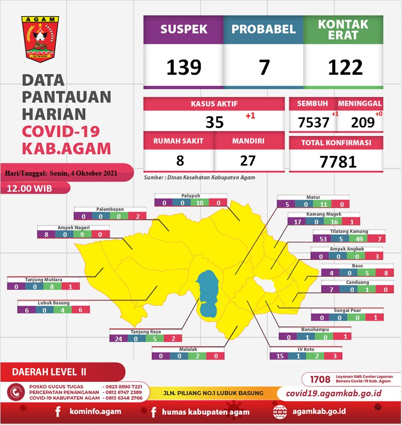 Lubukbasung, siberindo.co — Selasa,(5/10) di kabupaten Agam masih tersisa 34 kasus pandemic Covid-19 menyusul adanya penambahan 4 kasus positif baru dan 7 pasien sembuh.