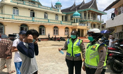 Selain melaksanakan pengamanan, Polwan Bukittinggi juga membagikan masker kepada masyarakat setelah pelaksanaan ibadah shalat Jumat.