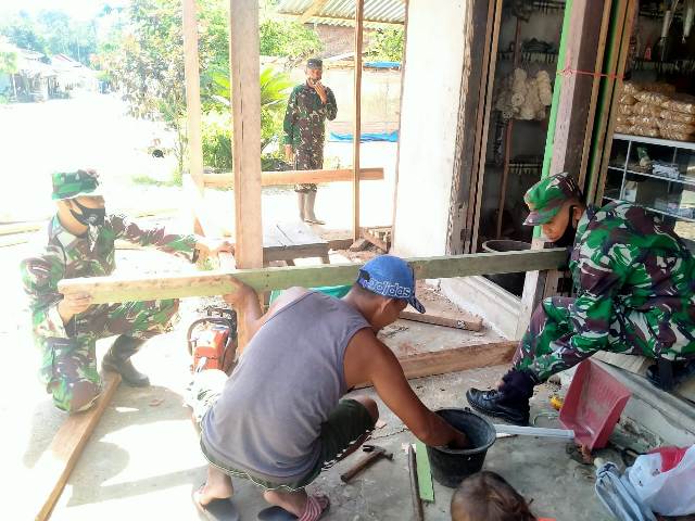 Dalam proses perbaikan warung ini, anggota Satgas membantu Bapak Hasan di sela-sela kegiatan yang mereka lakukan di Jorong Koto Gadang Nagari Maek, Kabupaten Limapuluh Kota, Selasa (6/7/2021)