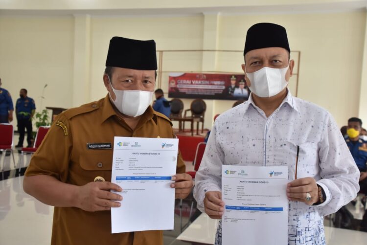 LUBUK BASUNG, Siberindo–Bupati Agam, Dr. H. Andri Warman dan Wakil Bupati Agam, Irwan Fikri, bersama dengan ASN Pemkab Agam Senin (5/7/2021) jalani vaksinasi dosis pertama. Vaksin massal diselenggarakan di Balairung komplek Dinas Bupati Agam di Padang Baru Lubuk Basung.