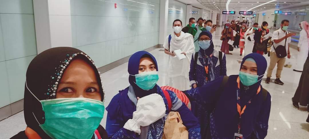 Meski ada suasana horor dalam menghadapi virus Corona tapi ada juga senyum yang tersungging. Karna saat datang, jamaah jamaah Indonesia disambut dengan ucapan selamat datang dan hidangan coklat dari pihak Arab Saudi.