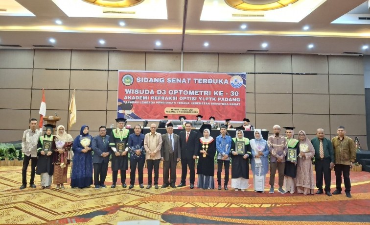 Akademi Refraksi Optisi (ARO) Yayasan Lembaga Pendidikan Tenaga Kesehatan (YLPTK) Padang menggelar acara wisuda ke-30 yang mewisuda 72 orang lulusan dengan gelar A.Md.,Kes di Covention Hall Hotel Truntum, Padang, Kamis (6/11/2025).