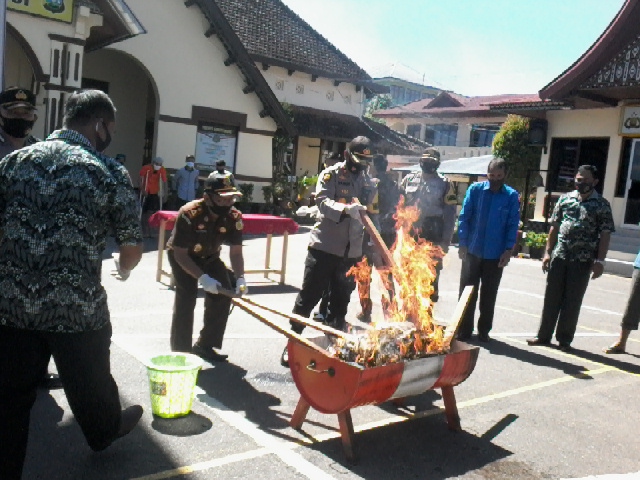 Pemusnahan barang bukti dilakukan atas dasar surat ketetapan LP.no.142/A/VII/2020, tgl 27/8 jelas Waka Polres Kompol. Indra Sandy Purnama Sakti, didampingi Kajari Sukardi, SH.MH.