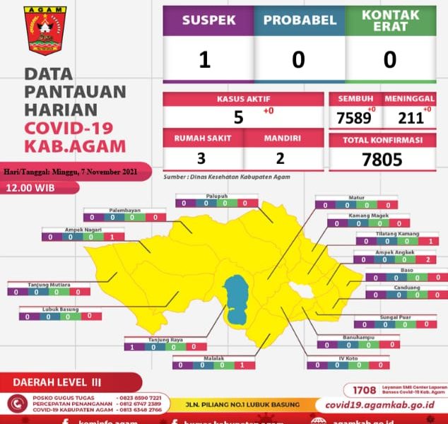Seperti dijelaskan Yosefriawan, Asisten II Sekab.Agam selaku Koordinator Bidang Data-Sosialisasi Satgas Penanganan Covid-19 Agam, yang menyebutkan, hingga saat ini, total akumulasi kasus pandemic Covid-19 di kabupaten Agam mencapai 7.805 kasus, dengan rincian 7.589 orang sudah dinyatakan sembuh, 211 meninggal dunia dan 5 kasus aktif, dengan pemantauan pada 1 suspek.