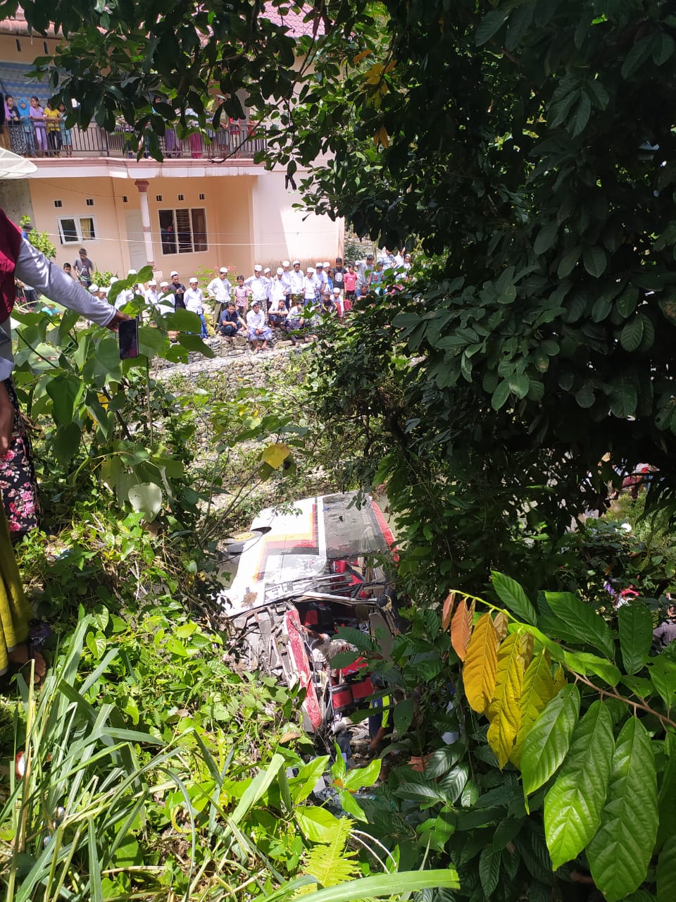 Bus Pariwisata yang ditumpangi 17 orang ASN Kab Agam jatuh ke aliran sungai kedalaman 10 meter , masyarakat setempat yang sedang di sawah langsung kaget mendengar suara adanya benturan keras.
