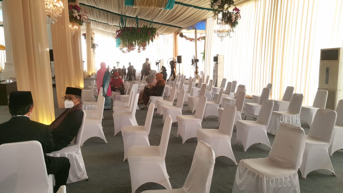 Walaupun suasana pesta pada pandemi Covid-19, terpancar dari wajah keluarga kedua mempelai sangat senang saat undangan memberikan ucapan selamat dengan memberikan salam santun tanpa bersentuhan dan berjarak.