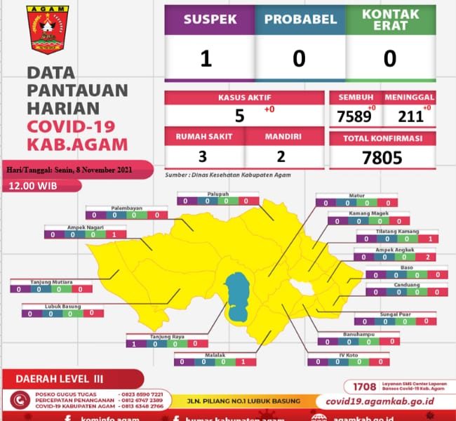Disebutkan, hingga Senin ini, total akumulasi kasus Covid-19 di kabupaten Agam mencapai 7.805 kasus dengan rincian 7.589 orang sudah dinyatakan sembuh, 211 orang meninggal dunia dan 5 kasus aktif yang tersebar di 4 kecamatan masing-masing 1 kasus dari kecamatan Ampek Nagari, Malalak, dan Tilatang Kamang serta 2 kasus dari kecamatan IV Angkek.
