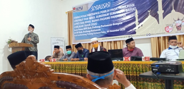 Demikian diungkapkan Anggota KPUD Padang Pariaman Ory Sativa Sakban dihadapan pengurus PCNU Padang Pariaman, pimpinan pesantren dan ulama, Selasa (8/12/2020) di aula FKUB Kementerian Agama Kabupaten Padang Pariaman, Kiambang. Kegiatan bertajuk sosialisasi peningkatan partisipasi pemilih pada pemilihan gubernur dan wakil gubernur Sumatera Barat, bupati dan wakil bupati Padang Pariaman Pemilihan tahun 2020, kerjasama KPU Kabupaten Padang Pariaman dengan PCNU Kabupaten Padang Pariaman.