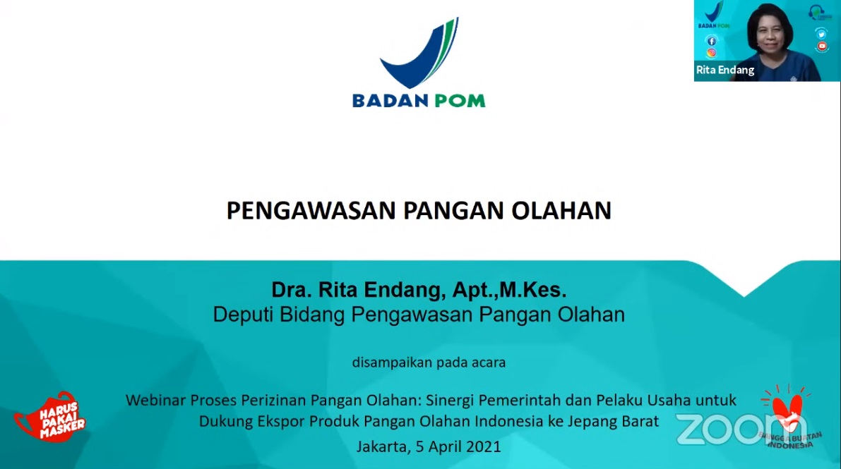 Osaka, Tokyo – Dalam rangka memperkuat pemahaman para pelaku usaha UMKM pangan olahan mengenai arti penting Izin Edar, KJRI Osaka bekerja sama dengan BPOM RI menyelenggarakan seminar daring bertajuk “Memahami Proses Perizinan Pangan Olahan” pada Senin (05/04/2021).