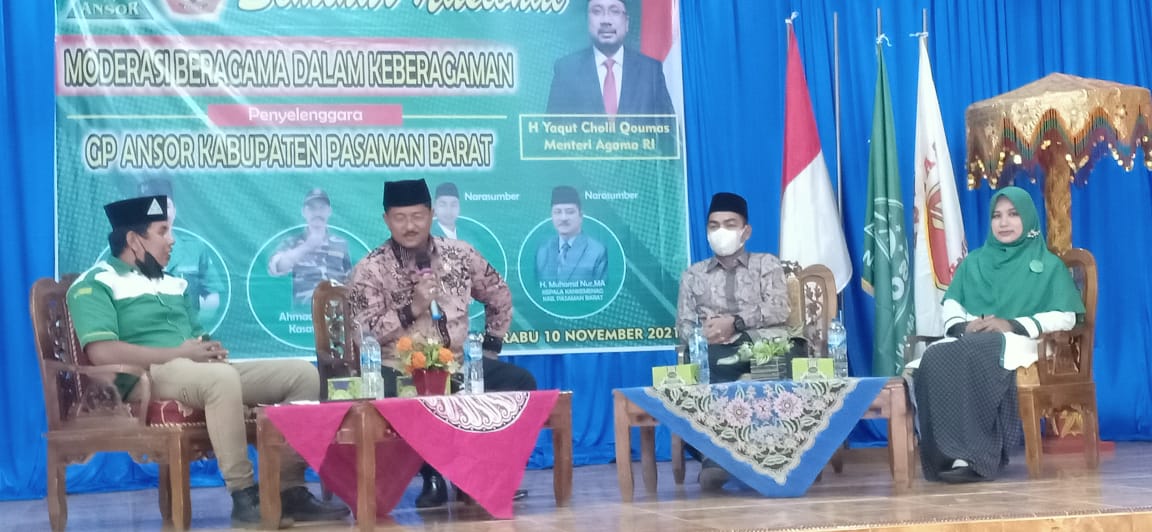 Demikian diungkapkan Staf Ahli Bupati Pasaman Barat Dr. Andrianto pada pembukaan Seminar Nasional Moderasi Beragama Dalam Keberagaman yang diselenggarakan Pimpinan Cabang Gerakan Pemuda Ansor Pasaman Barat, Rabu (10/11/2021) di aula STAI Yaptis, Simpang Empat Pasaman Barat. Tampil sebagai narasumber Ketua PW GP Ansor Sumbar Dr. Rahmat Tuanku Sulaiman dan Kepala Kantor Kementerian Agama Pasaman Barat Muhammad Nur, MA. Hadir Ketua STAI YAPTIS Mita Fitra dan Ketua PC GP Ansor Pasaman Suilman.