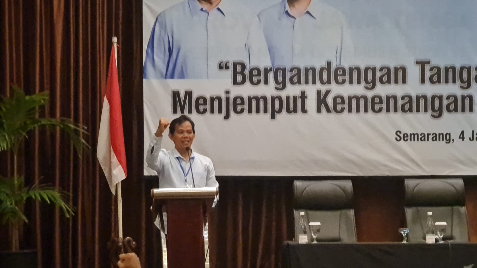 Secara serentak sekitar 250 orang serentak berdiri dan mengepalkan tangan. Siang untuk gedung Patra Jasa Semarang seperti tengah digoncang oleh energi yang dashyat. “Prabowo-Gibran Satu Putaran!!