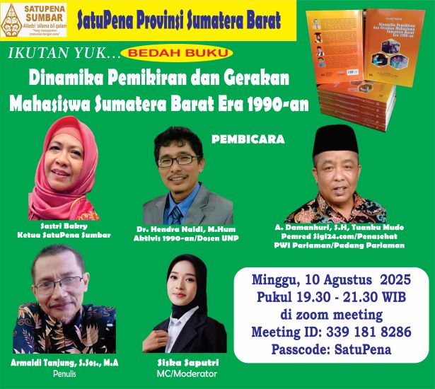 Demikian diungkapkan aktivis mahasiswa era 1990-an Dr. Hendra Naldi, S.S., M.Hum, dan Pemimpin Redaksi Sigi24.com Ahmad Damanhuri, SH, Tuanku Mudo, pada bedah buku “Dinamika Pemikiran dan Gerakan Mahasiswa Sumatera Barat Era 1990-an”, yang ditulis Armaidi Tanjung, Sekretaris SatuPena Provinsi Sumatera Barat, Minggu (10/8/2025) malam melalui zoom meeting.