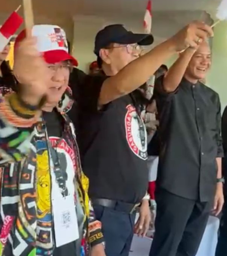 Anwar duduk di barisan depan di tribun bersama Ganjar Pranowo diapit aktor Roy Marten. Sesekali mereka berdiri mengayunkan bendera merah putih kecil sambil bernyanyi gembira.