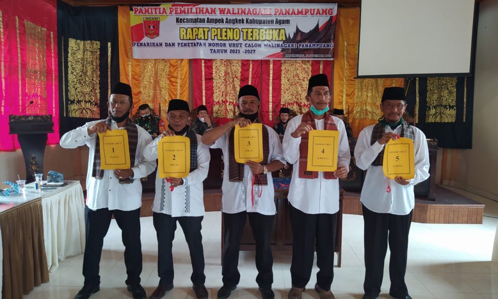 Penetapan nomor urut 5 calon walinagari Panampuang itu melalui sidang pleno panitia Pilwana Minggu,(12/9) di aula kantor walinagari Panampuang, yang ditandatangani masing- masing panitia M.R.Dt.Mangkuto Basa, selaku ketua, Hafizul Hazim,SH, wakil ketua, dan tiga anggota masing-masing Misra Denni Hartati,Ovi Silvia,SPd, dan Azizi Fakhruri,SE,I.