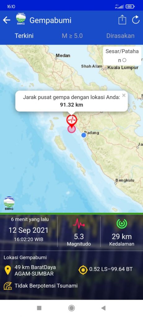 Warga Panik, Gempa 5,3 SR di Laut Tiku Guncang Agam
