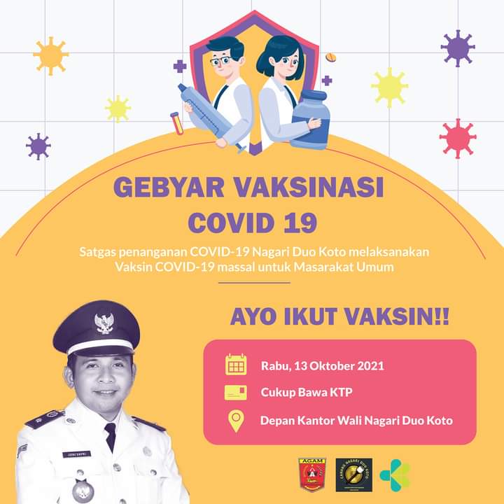 Duo Koto, siberindo.co — Pemerintah Nagari Duo Koto, Kecamatan Tanjung Raya, Kabupaten Agam akan menggelar vaksinasi Covid-19 untuk masyarakat umum di aula kantor walinagari, Rabu (13/10) besok.