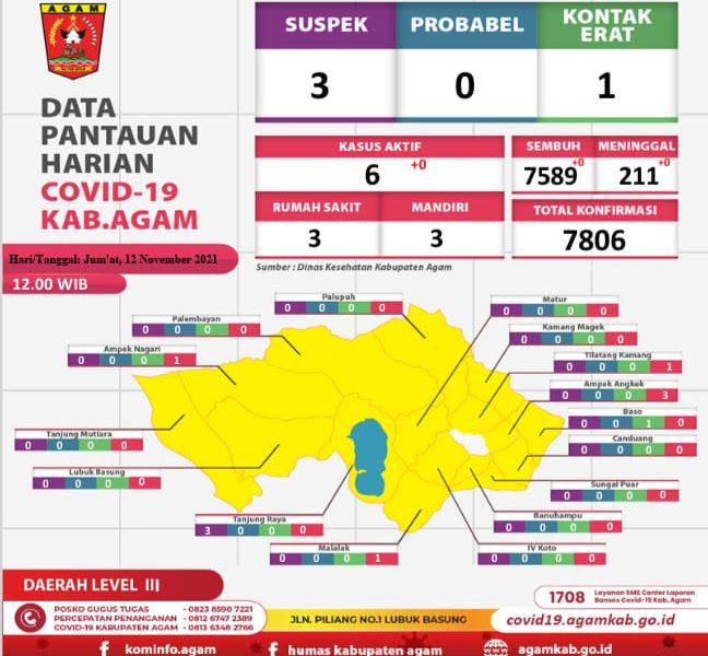 Lubukbasung, siberindo.co — Jumat,(12/11) di kabupaten Agam tidak ada penambahan kasus terkonfirmasi baru, pasien sembuh maupun warga yang meninggal akibat paparan covid-19. Jumlah kasus aktif masih beradadi posisi 6 orang, masing-masing 3 orang dirawat di beberapa rumah sakit rujukan Covid-19 dan 3 orang menjalani isolasi mandiri.