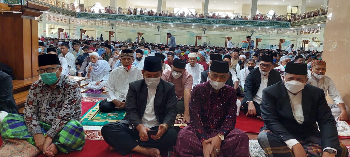 Antusian jamaah tidak terbendung dan membludak sampai memanfaatkan halaman masjid Agung dengan menerapkan secara ketat protokol kesehatan Covid-19, dengan khatib Syafwan Diran dan Imam Nofrion.