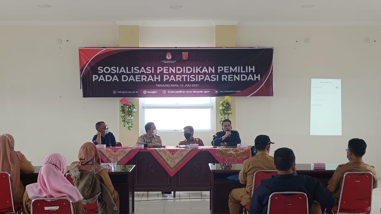 Maninjau, siberindo — Komisi Pemilihan Umum (KPU) Kabupaten Agam melaksanakan kegiatan sosialisasi pendidikan pemilih pada daerah partisipasi rendah di Kecamatan Tanjung Raya, Selasa (13/7).
