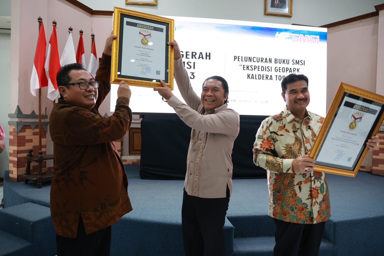 Penjabat (Pj) Gubernur Banten Al Muktabar menerima Anugerah Sahabat Pers Serikat Media Siber Indonesia (SMSI) 2023 di Hall Dewan Pers Jl. Kebon Sirih No. 32 – 34 Jakarta, Jum’at (11/8/2023). Anugerah diserahkan oleh Ketua Serikat Media Siber Indonesia (SMSI) Firdaus.