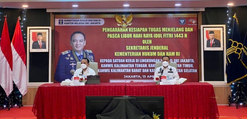 Pengarahan Andap dalam rangka persiapan tugas menjelang dan pasca libur hari raya Idul Fitri 1443 H dilakukan secara tatap muka di Kanwil DKI Jakarta. Sementara itu jajaran Kemenkumham di Kalimantan mengikuti secara virtual. (*)