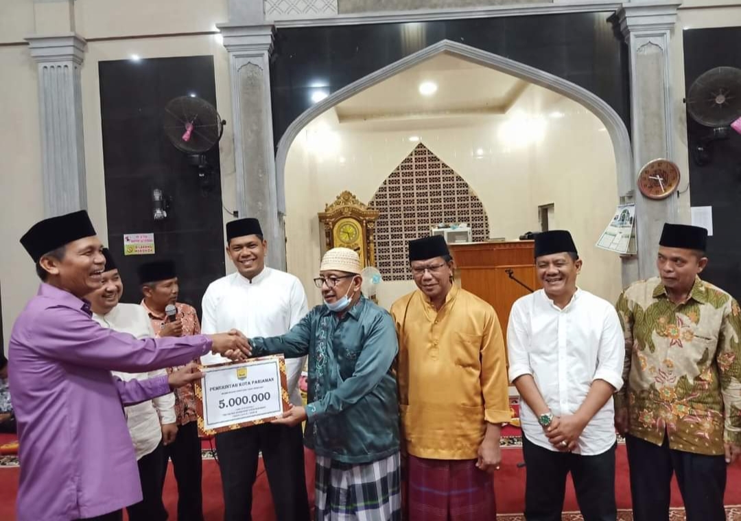 Pada kesempatan ini Wali Kota Pariaman Genius Umar menyerahkan bantuan Pemko sebesar Rp5 jut yang diterima Ketua Mesjid H. Irvan Khairul Ananda, SE didampingi oleh Sekretaris Alfian Harun. Bantuan juga diterima dari Kacab Bank Nagari Pariaman sebesar Rp2,5 juta serta satu paket Mushaf Al Qur’an.