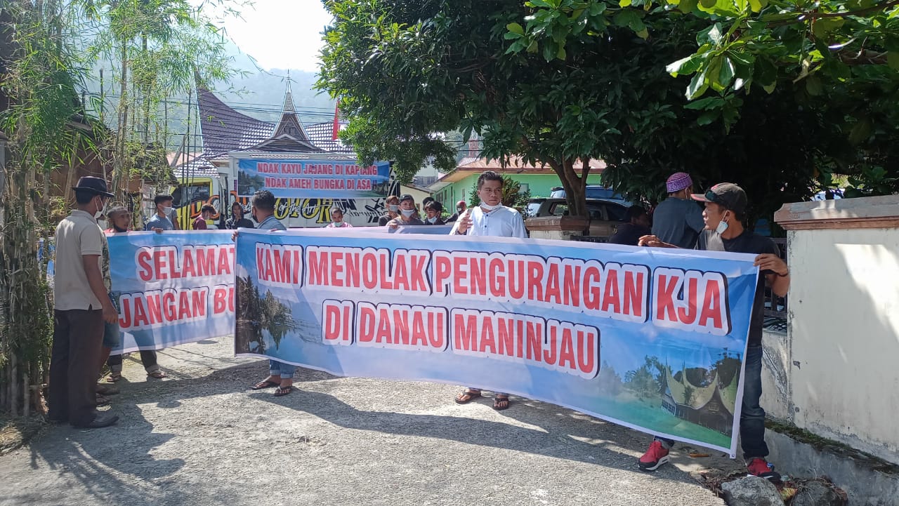 Mereka menyampaikan aspirasi melalui spanduk yang dipasang di pagar kantor camat yang bertuliskan ‘Kami Menolak Pengurangan KJA di Danau Maninjau’ dan ‘Dengan KJA Kami Bisa Ciptakan Lapangan Kerja’.