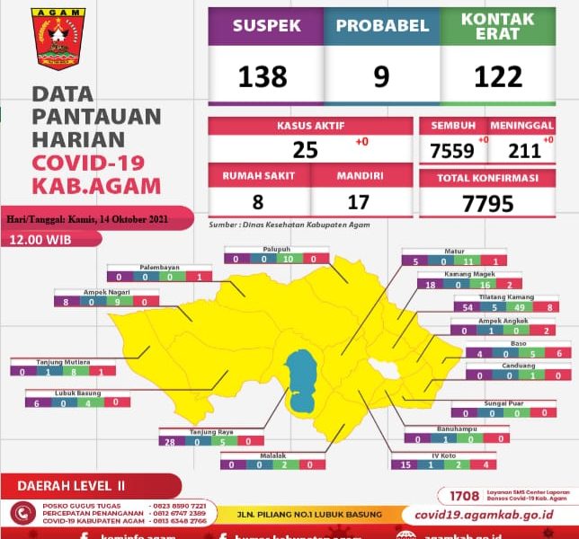 Lubukbasung,siberindo.co — Kasus Covid-19 di kabupaten Agam Kamis,(14/10) ini tidak ada pergerakan, dibuktikan tidak adanya penambahan kasus baru, pasien sembuh maupun warga yang meninggal dunia.