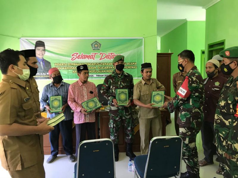 MENTAWAI – Selesai melaksanakan penyuluhan Agama, Dansatgas TMMD Ke- 110 Kodim 0319 Mentawai Letkol Czi Bagus Mardyanto, S.T ,M.Tr (Han) bersama Kemenag Mentawai menyerahkan bantuan kitab Suci Al-Quran kepada Pengurus pengurus Mesjid di Kantor Kemenag, Senin (15/03/2021).