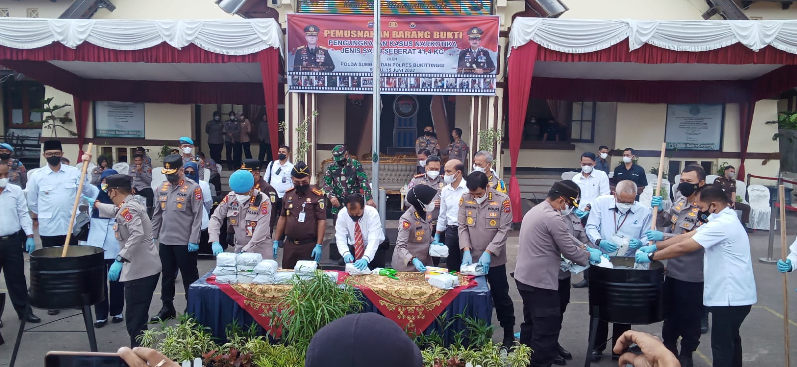 Narkoba jenis sabu seberat 141,4 kg, bernilai Rp 62,1 milyar beberapa waktu lalu. Pemusnahan dilakukan di halaman Mapolres Bukittinggi, Rabu (15/06).