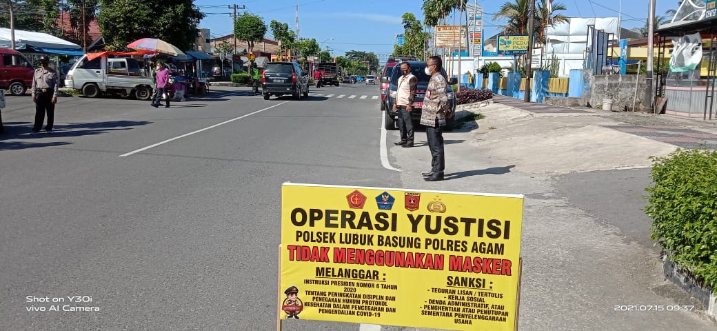 Seperti halnya di kawasan Pasar Padang Baru, Lubukbasung, Kamis,(15/7), tim yustisi gabungan yang dipimpin Kapolsek Lubukbasung bersama camat Lubukbasung, seluruh walinagari, bahkan ketua KAN Lubukbasung Novi Endri Dt.Simarajo ikut terjun ke lapangan bersama seluruh walijorong terjun langsung dalam operasi yustisi penerapan protokol kesehatan tersebut.