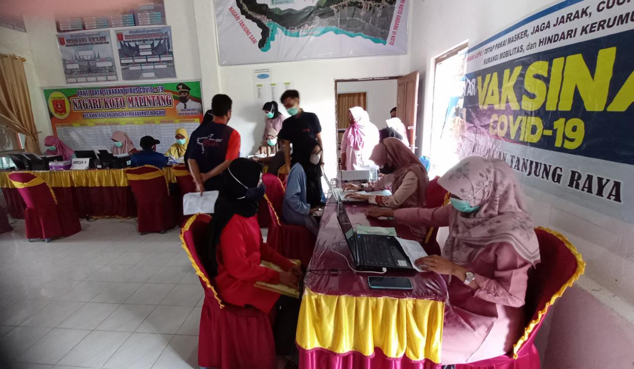 Kotomalintang, siberindo.co — Ratusan masyarakat Nagari Koto Malintang, Kecamatan Tanjung Raya, Kabupaten Agam mengikuti vaksinasi Covid-19, Jum’at (15/10). Gebyar vaksinasi massal ini dipusatkan di kantor walinagari setempat.