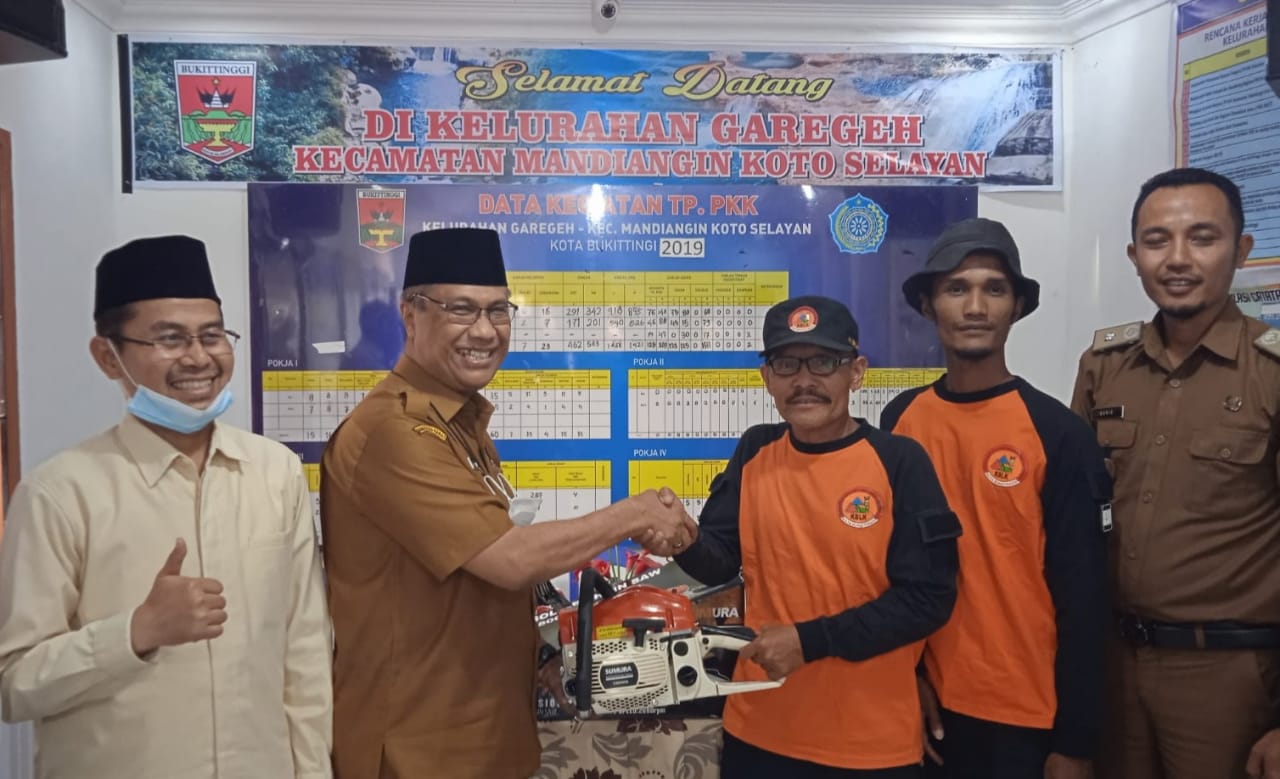 Bukittinggi, siberindo.co — Kota Bukittinggi cukup rawan mengalami bencana alam. Salah satu yang sering terjadi, pohon tumbang saat terjadi hujan atau angin kencang. Meminimalisir terjadi hal tersebut, Anggota DPRD Kota Bukittinggi Fraksi PKS, menyerahkan satu unit chainsaw (sinso) untuk Kelurahan Garegeh. Bantuan tersebut dapat dipergunakan oleh Ketahanan Bencana Lingkungan Kelurahan (KBLK) Garegeh untuk menghadapi bencana yang sewaktu-sewaktu terjadi di Kelurahan Garegeh. Penyerahan ini dihadiri langsung oleh Wakil Walikota Bukittinggi Marfendi, Anggota DPRD Kota Bukittinggi, Ibnu Asis, Lurah Garegeh Berry, Ketua LPM Garegeh Ahmad Lukman, pengurus KBLK Garegeh, Niniak Mamak Garegeh F Dt. Labuah Basa, serta perangkat Kelurahan Garegeh, Senin (14/02) lalu.