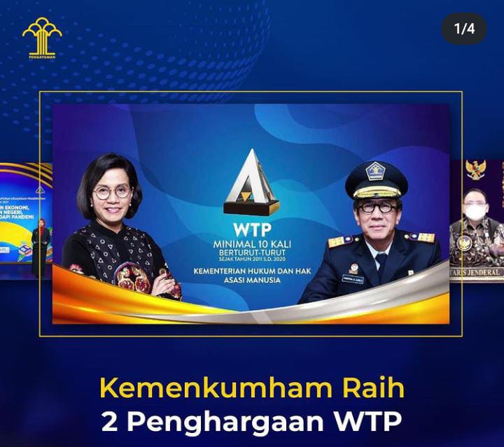 Jakarta, Siberindo.co – Kementerian Hukum dan HAM (Kemenkumham) meraih dua penghargaan dari Kementerian Keuangan (Kemenkeu) untuk perolehan opini Wajar Tanpa Pengecualian (WTP) atas laporan keuangan yang telah disusun. Penghargaan diberikan untuk kategori opini WTP tahun 2020 dan kategori opini WTP minimal 10 kali berturut pada tahun 2011-2020.