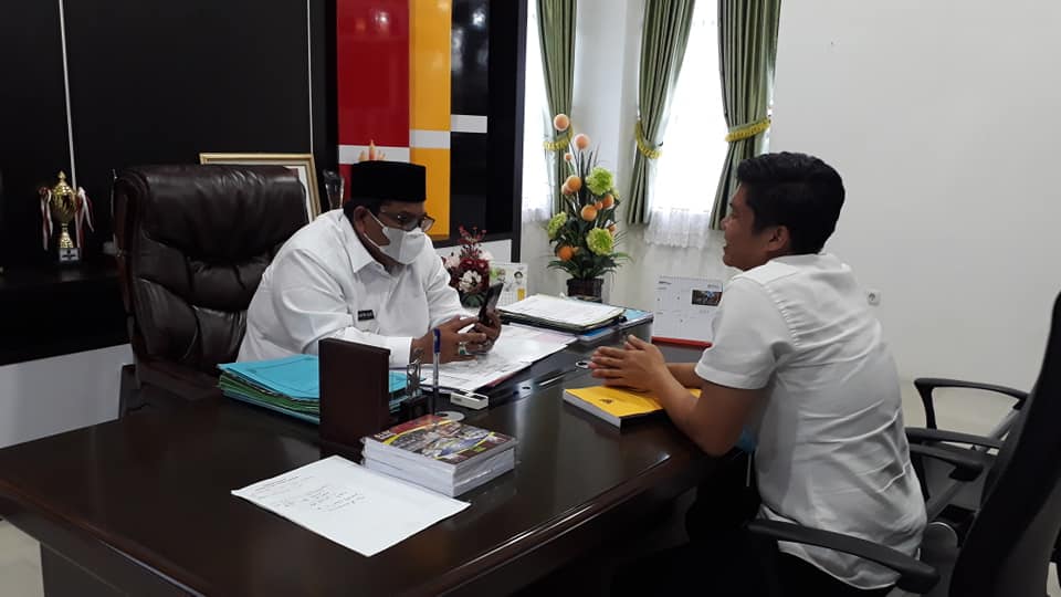 “Tadi Bapak Bupati menyampaikan agar semua elemen harus ditingkatkan untuk mencapai APIP level 3” kata jebolan STPDN Angkatan XI itu. Ket :Bupati Suhatri Bur mendukung penuh peningkatankapasitas APIP level 3 saat menerima laporan dari Inspektur Hendra Aswara di Ruang kerjanya, Parit Malintang, Jumat (16/4). (at)