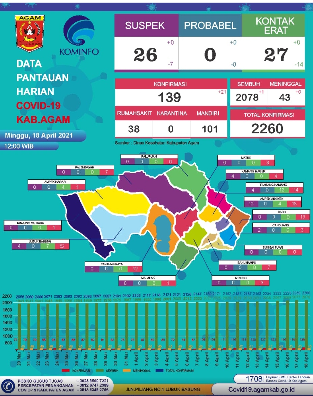 SUMBAR, Siberindo- Prediksi terjadinya peningkatan kasus terkonfirmasi baru Covid-19 di kabupaten Agam terbukti. Minggu,(18/4) hari ini, kabupaten Agam mencatatkan penambahan 21 kasus terkonfirmasi baru sehingga total terkonfirmasi Covid-19 di kabupaten Agam sudah mencapai 2.260 orang.