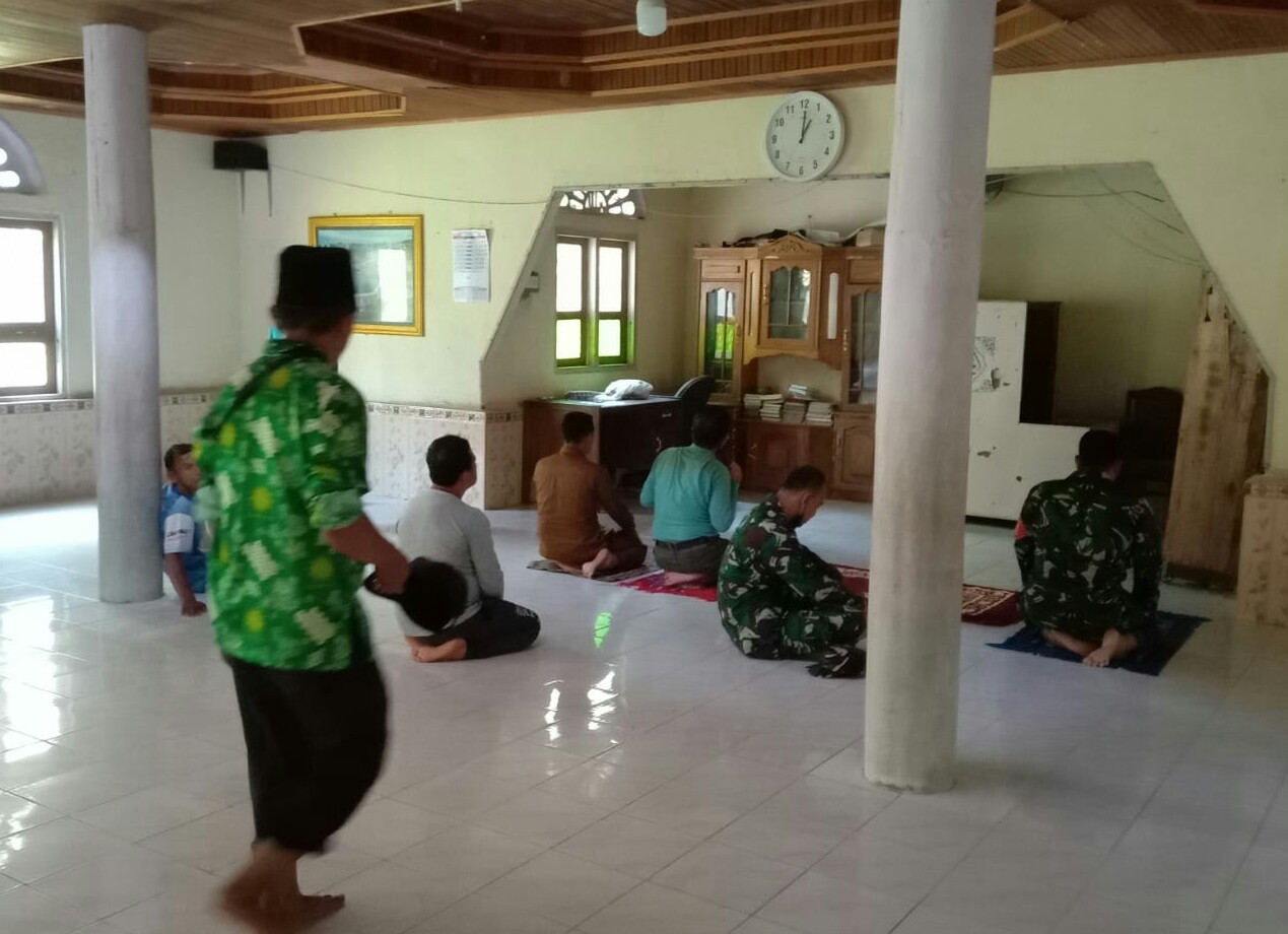 Siang Kamis (17/6/2021) Personil Satgas TMMDN Kodim 0306/50 Kota berbaur bersama warga masyarakat melaksanakan sholat zuhur berjamaah di masjid Darussalam, Jorong Talang, Nagari Talang Maur, Kecamatan Mungka.