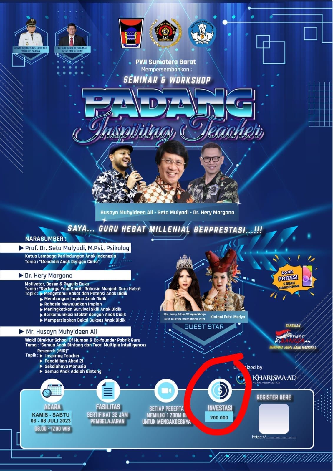 Seminar dan workshop berbayar dengan judul besar ” PADANG Inspiring Teacher”. Menampilkan tiga orang narasumber hebat dan top. Mereka adalah Prof Dr.Seto Mulyadi, Dr. Hery Margono dan Mr Husayn Muhyideen Ali.