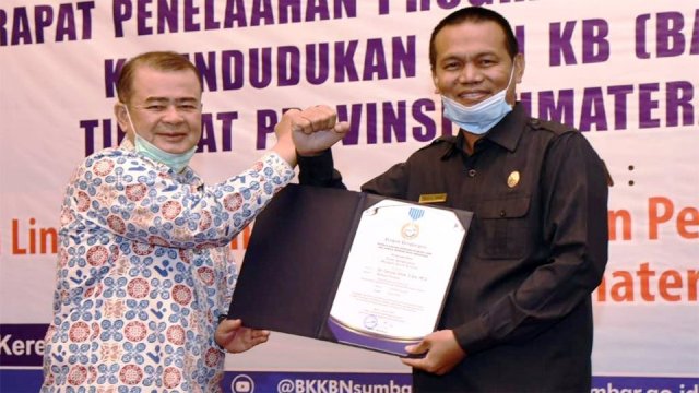 Penghargaan MKK Bidang Bangga Kencana Tahun 2020 diserahkan Wakil Gubernur Sumatera Barat Nasrul Habit dalam acara Rapat Penelaahan Program Pembangunan Keluarga Kependudukan dan KB (Banggakencana) Tingkat Provinsi Sumatera Barat 2020 di Hotel Axana Padang, Selasa (18/8).