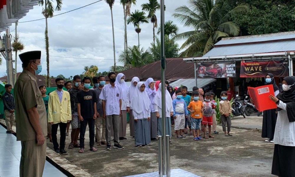 Upacara yang digelar dengan protokol kesehatan ketat terutama memakai masker, dilaksanakan di halaman SMA Muhammadiyah Salareh Aia dengan penuh khidmat.